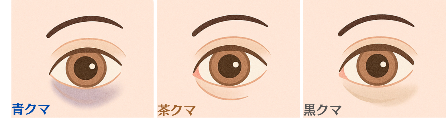 クマ治療を考える前に、まずご自身のクマのタイプを知ることが重要です。クマには主に3種類(黒クマ、青クマ、茶クマ)あり、それぞれ原因と最適な治療法が異なります。