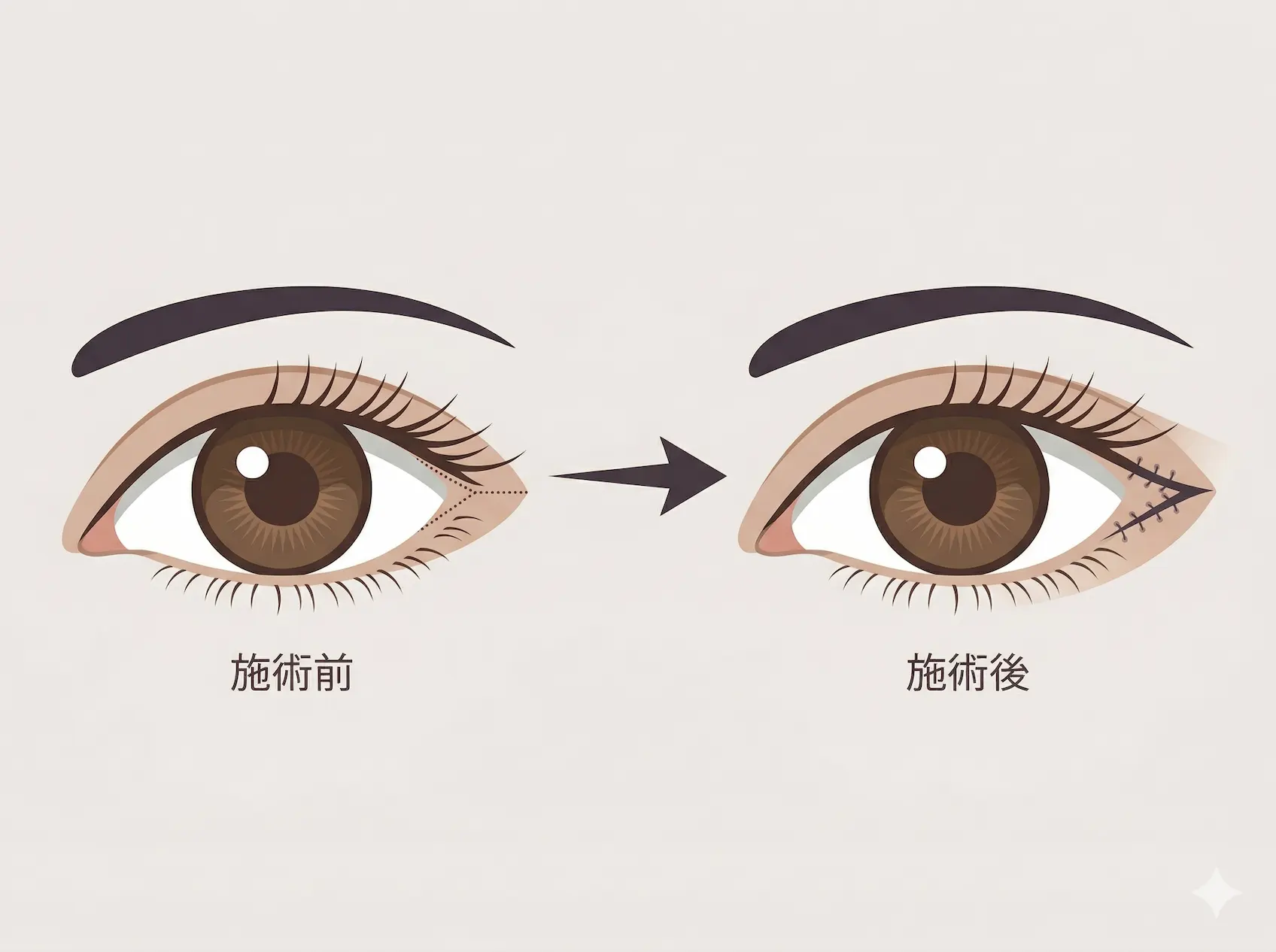 目尻切開では、目尻の端にある皮膚を切開し、隠れていた白目と粘膜を露出させることで目の横幅を広げます。切開幅は2〜4mm程度ですが、目尻が外側に開くことで目全体のバランスが変わり、正面から見たときの印象が変化します。